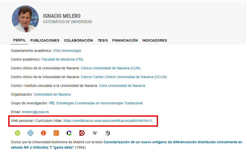 En el Portal científico de la Universidad, el personal investigador puede incluir en su Perfil una URL personal con un PDF de su CV obtenido desde científicacvn (ver guía). Este CV en PDF puede ser actualizado, editado o suprimido por el investigador en cualquier momento.
