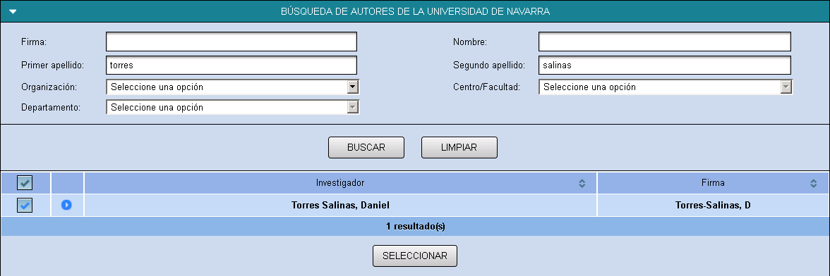 • Investigador de la UN: Si el coautor del trabajo pertenece también a la UN, se deben localizar sus datos a través del módulo de "Búsqueda de autores de la Universidad de Navarra" y seleccionar.