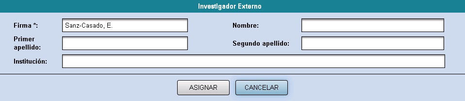 • Investigador no adscrito a la UN: Si el coautor del trabajo no pertenece a la UN, se debe dar de alta a través del módulo de "Altas externos". El único campo obligatorio de este módulo es la firma del autor.