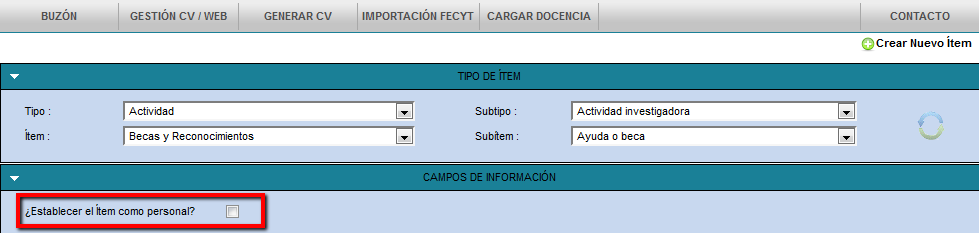 Si el investigador desea que un ítem registrado en el que consta como único asignado (que no se ve afectado por el proceso de validación, por ej. "Aportaciones a congresos") no pueda ser seleccionado para publicarse en el CV en pdf, deberá establecer el ítem como personal, marcando la casilla correspondiente del formulario.
