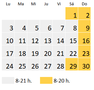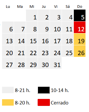 El horario en octubre es de lunes a sábado de 8 a 21 h y domingo de 8 a 20 h, a excepción de los siguientes días: