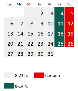 El horario en octubre es de lunes a viernes de 8 a 21 h y sábado de 8 a 14 h.