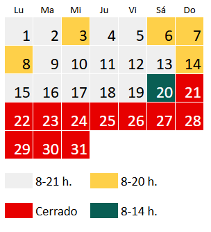 El horario en noviembre es de lunes a sábado de 8 a 21 h, a excepción de los siguientes días: